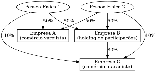 O cálculo da participação total ficaria assim: se a “Pessoa Física 1” participa com 10% da “Empresa C” e, além disso, a “Pessoa Física 1” participa com 50% da “Empresa B” que, por sua vez, participa com 80% da “Empresa C“; isso quer dizer que a “Pessoa Física 1” possui participação direta de 10% na “Empresa C” + uma participação indireta de 40% na “Empresa C”; perfazendo uma participação total de 50% na “Empresa C“.